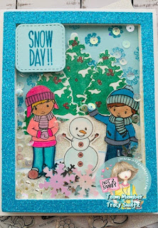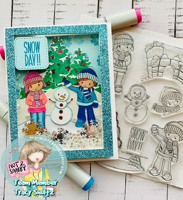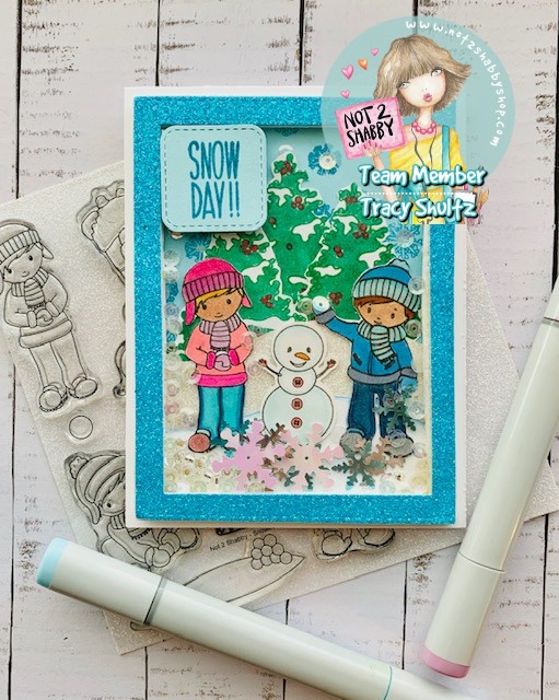 For my first DT project I chose to make a shaker card using the Not2Shabby Stamp Set "Snowball Fight."