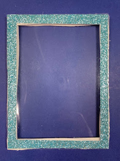 Using glitter stock, I cut out a 4x5 frame. I also cut out a piece of acetate and three fun foam frames. I layered the fun foam frames on top of each other and secured them using double sided tape. Then I adhered the glitter card stock to the pieces of fun foam.