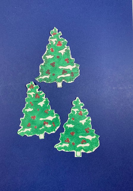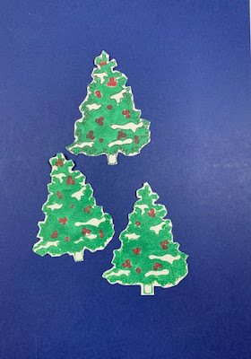 Using glitter card stock I made a snow bank. I made a second snow bank on white card stock. I put light blue ink along the edge of the second snow bank (for snow).